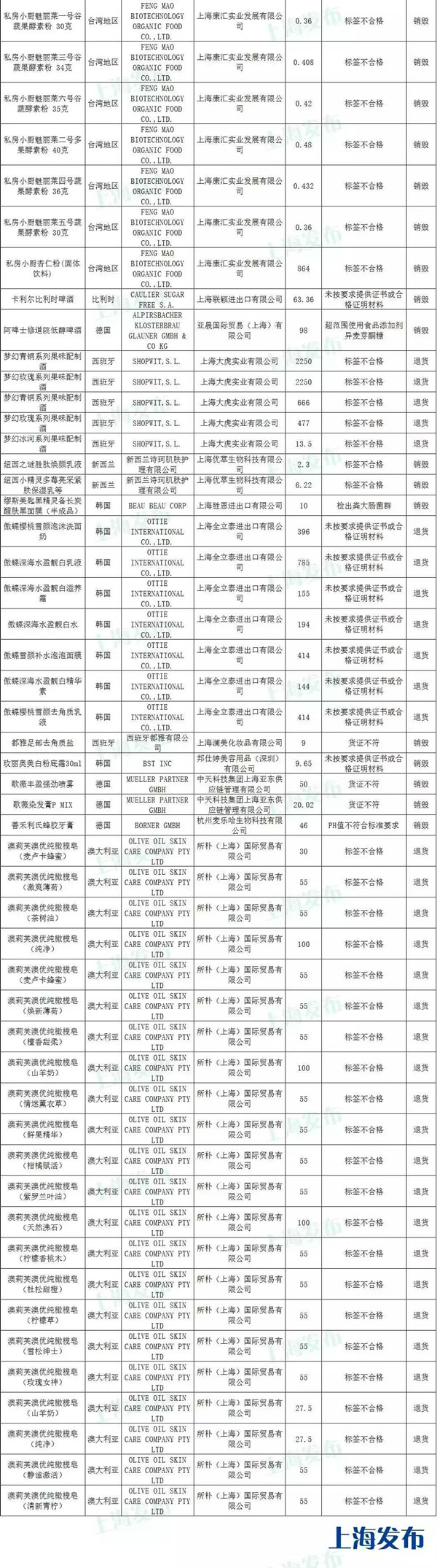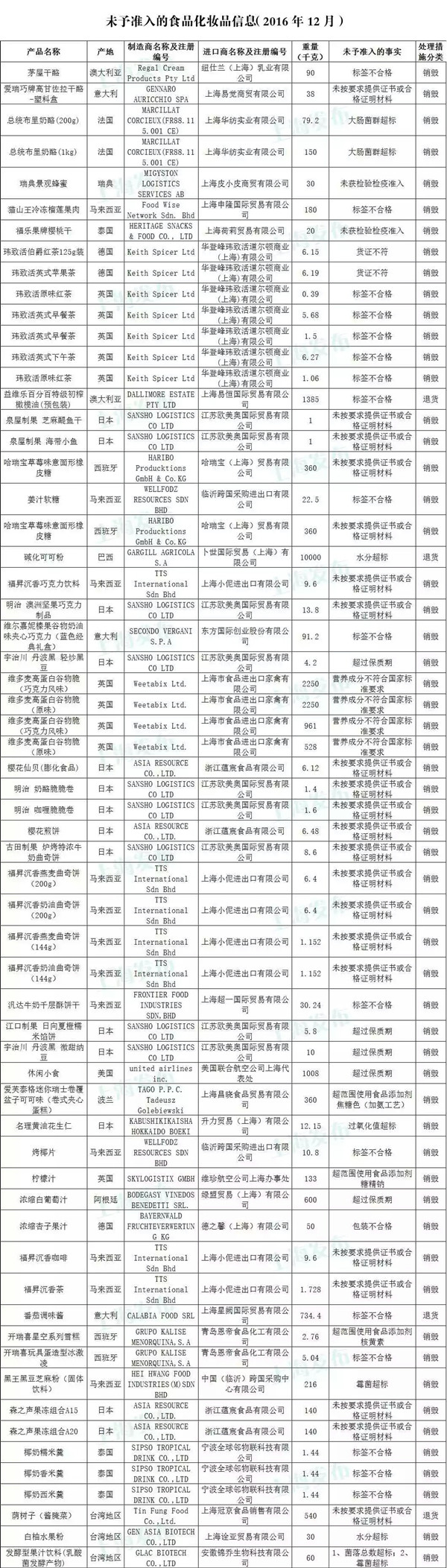 央廣網上海2月10日消息 上海出入境檢驗檢疫局今天公布去年12月份未予準入的進境食品、化妝品信息,包括法國產的總統布里奶酪、泰國產的福樂果牌櫻桃干、英國產的瑋致活原味紅茶、德國產的歌薇染發膏、澳大利亞產的澳莉芙澳優純橄欖皂等。未予準入的產品都已依法作退貨或銷毀處理。