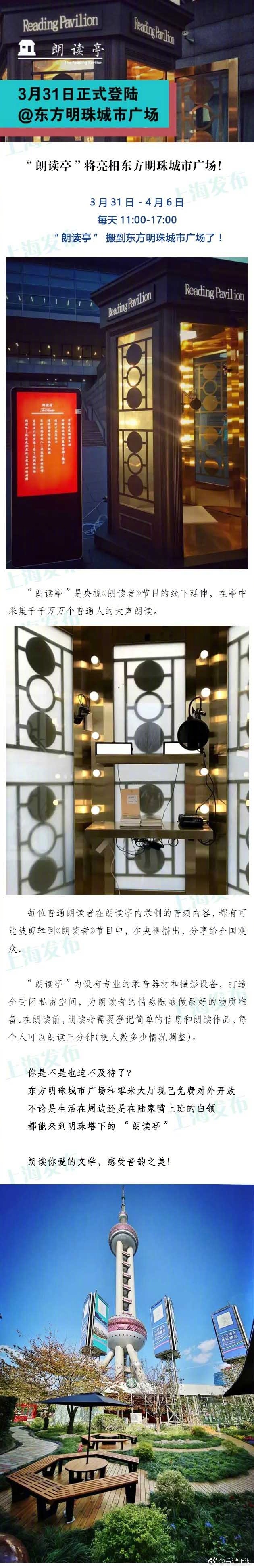 央廣網上海3月30日消息 據樂游上海發布稱,熱愛朗讀的小伙伴注意!繼徐匯濱江西岸之后,網紅“朗讀亭”又于3月31日至4月6日亮相東方明珠城市廣場,你可以在“朗讀亭”里將經典文選讀給親友或自己,感受讀書的樂趣。