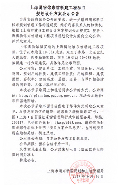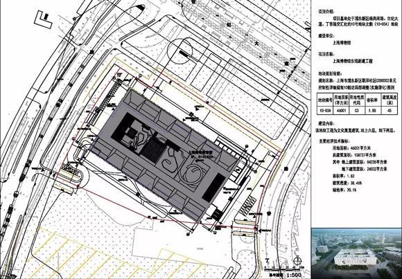根據(jù)公式信息,上海博物館東館選址花木地塊,東至丁香路,北至世紀大道綠帶,西至楊高南路,將會是一棟六層建筑。用地面積46001平方米,總建筑面積108737平方米,其中地上面積84235平方米,地下面積24502平方米,容積率1.83、建筑高度45米。