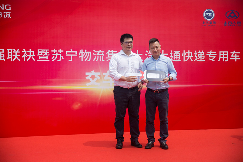 5月18日上午10點,上海蘇寧易購總經理徐海瀾(右)與上汽銷售副總經理薛正華(左)完成快遞專用車鑰匙交接儀式