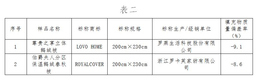 此外,鵝絨填充量的多少,也會直接影響到羽絨被的保暖程度。本次比較試驗(yàn)的30件樣品中,2件樣品充絨量表現(xiàn)良好,偏差率高于–1%;26件樣品偏差率在-5%至-1%之間(含-5%和-1%);2件樣品的表現(xiàn)較差,偏差率低于–5%(詳見表二)。