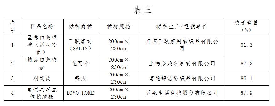 在充絨量相同的情況下,羽絨被的絨子含量越高其保暖性也越好。絨子含量是指絨子在羽絨填充物中的含量百分比。按照相關(guān)行業(yè)標(biāo)準(zhǔn)要求,絨子含量允許有5%的負(fù)偏差。本次比較試驗(yàn)的30件樣品均標(biāo)稱絨子含量(或含絨量)達(dá)到95%,測試結(jié)果顯示絨子含量最高為94.4%,最低為81.3%。其中26件樣品的絨子含量大于90%,4件樣品絨子含量較低(詳見表三)。