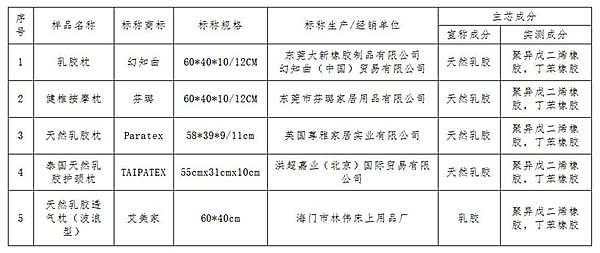 據悉,乳膠枕是以天然乳膠(學名:聚異戊二烯橡膠)或以天然乳膠和合成乳膠(學名:丁苯橡膠)為主芯的枕類。測試結果顯示,20件樣品中,有5件樣品實測主芯成分與其明示不相符(詳見表一)。而記憶枕是以聚氨酯(PU)為主芯的枕類,測試結果顯示,20件樣品實測主芯成分與其標稱成分均相符。