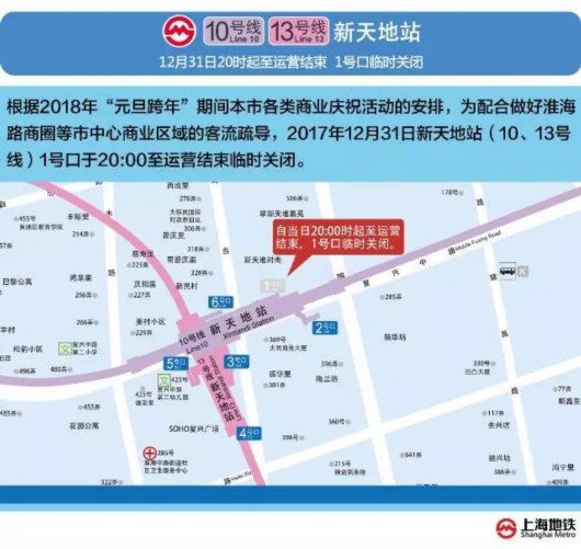 據(jù)上海發(fā)布官方微信,上海發(fā)布準(zhǔn)備跨年夜出去玩的小伙伴們注意啦!申通地鐵集團(tuán)說,12月29-31日,1、2、7、8、9、10號線執(zhí)行周末延時運(yùn)行圖。同時,12月31日20點(diǎn)起至運(yùn)營結(jié)束,2、10號線南京東路站臨時封站,10、13號線新天地站臨時關(guān)閉1號口。