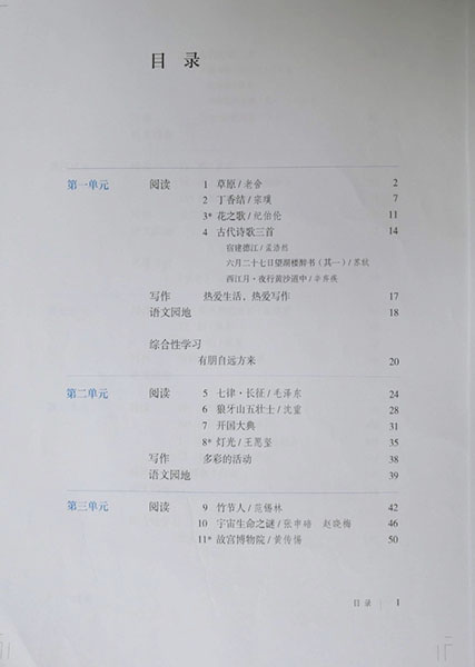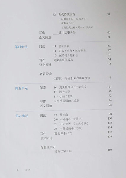 翻看全國統編教材六年級語文課本,一名資深語文老師表示,這本教材大致有以下幾個特點:一、強調對“中國心”的培養,比如增選古詩文,注重紅色經典的浸潤等。二、強調語文的味道,比如注重日常積累,強調閱讀的質與量,選文的文學性較強。三、強調作文的系統性。比如每個單元都有“寫作”部分,六個單元之間也大體有跡可尋,形成一定的系統。