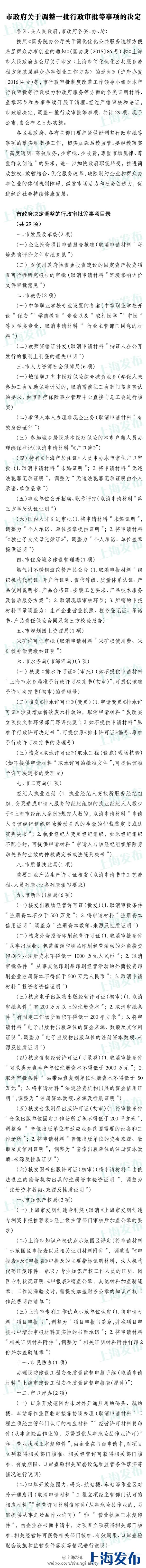 央廣網上海1月19日消息 據上海市政府新聞辦公室官方微博表示:經過嚴格審核和論證,上海市政府決定調整29項行政審批等事項。包括:①參加城鄉居保的本市戶籍人員辦理續保時,取消申請材料“《戶口簿》”;②持有《上海市居住證》人員申辦本市常住戶口審批時,取消申請材料“未婚證明”、將申請材料“無違法犯罪記錄證明”,調整為“無違法犯罪記錄證明由個人承諾、單位蓋章”③事業單位公開招聘、職稱評定時,取消申請材料“第三方學歷認證證明”等。