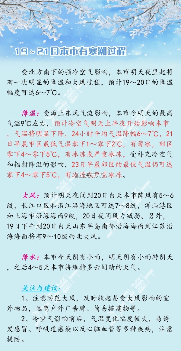 央廣網上海1月18日消息 據上海市氣象局官方微博@上海市天氣消息,受北方南下的強冷空氣影響,上海明天夜里起將有一次明顯的降溫和大風過程,預計19~20日的降溫幅度可達6~7℃,21日早晨市區最低氣溫零下1~零下2℃,有薄冰,郊區零下4~零下5℃,有冰凍或嚴重冰凍, 23日早晨郊區的最低氣溫仍可達零下4~零下5℃。