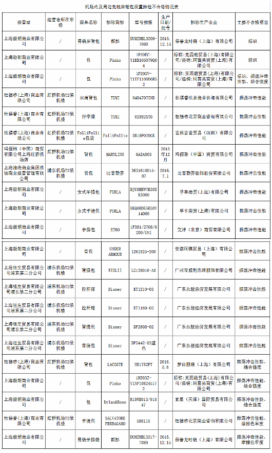 其中,虹橋機場T2候機樓內的杜福睿(上海)商業有限公司銷售的標稱由杜福睿北京商業咨詢有限公司生產(供貨)的“SALVATORE FERRAGAMO”牌手提包(型號規格:586115),其雙提把測試18次后,前身提把左側連接處金屬圈變形脫落、后身提把右側連接處金屬圈變形脫落;該公司銷售的另一款“TUMI”牌行李箱(型號規格:028821TG),拉桿測試300次后,發現拉合不順暢。