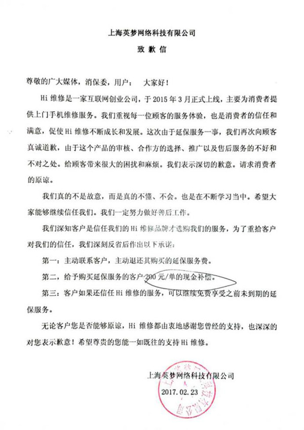 上海英夢網絡科技有限公司表示,首先將主動聯系客戶,退還其購買額延保服務費。其次將給予購買延保服務的客戶200元/單的現金補償。如果顧客還愿意使用Hi維修的服務,可以選擇繼續享受之前未到期的延保服務。