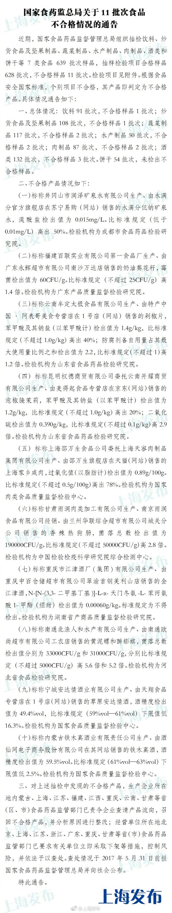 央廣網上海3月27日消息 據上海市政府新聞辦公室官方微博發布稱,國家食藥監總局組織抽檢639批次食品,共11批次不合格,包括標稱云南牟定太極食品有限公司生產、由特產中國·阿表哥美食專營店在1號店(網站)銷售的剁椒片,標稱昆明權德商貿有限公司委托云南開耀商貿有限公司生產、由麥得起食品專營店在京東(網站)銷售的泡椒腌茉莉等,涉及防腐劑、二氧化硫、苯甲酸及其鈉鹽超標等問題。