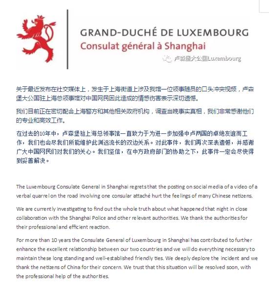 4月9日,盧森堡駐上?傤I事館就發生于上海街道涉及一位領事隨員的口頭沖突視頻發表官方聲明:關于最近發布在社交媒體上,發生于上海街道上涉及我館一位領事隨員的口頭沖突視頻,盧森堡大公國駐上海總領事館對中國網民因此造成的情感傷害表示深切遺憾。我們目前正在密切配合上海警方和其他相關政府機構,調查當晚事實真相,我們非常感謝他們的專業和高效工作。