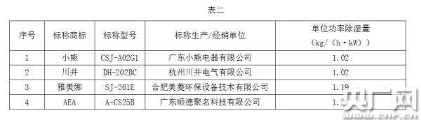 作為評價除濕機除濕效率的一個重要指標,除濕效率(單位輸入功率除濕量)同樣差異明顯。據了解,單位輸入功率除濕量是名義除濕量與輸入功率的比值,數值越高說明產品在相同耗電量的情況下,除濕能力越強,產品越節能。測試結果顯示,數值最高達到1.85 kg/(h·kW),最低的為1.02 kg/(h·kW),其中3件樣品的數值在1.6 kg/(h·kW)以上,除濕效率高;4件樣品在1.3 kg/(h·kW)以下,除濕效率較低(詳見表二)。例如輸入功率為0.209kW的小熊除濕機(標稱型號:CSJ-A02G1),其單位輸入功率除濕量僅為1.02 kg/(h·kW),兩者相差超過50%。