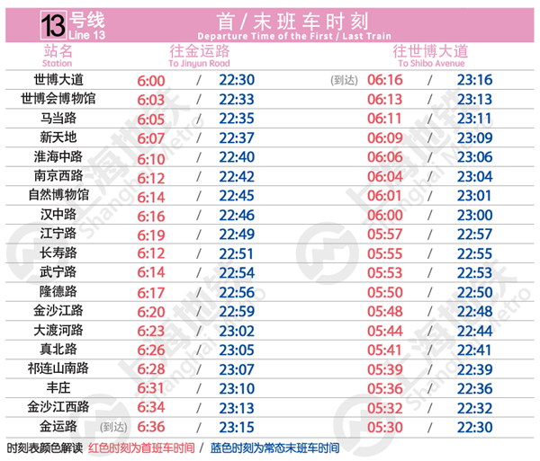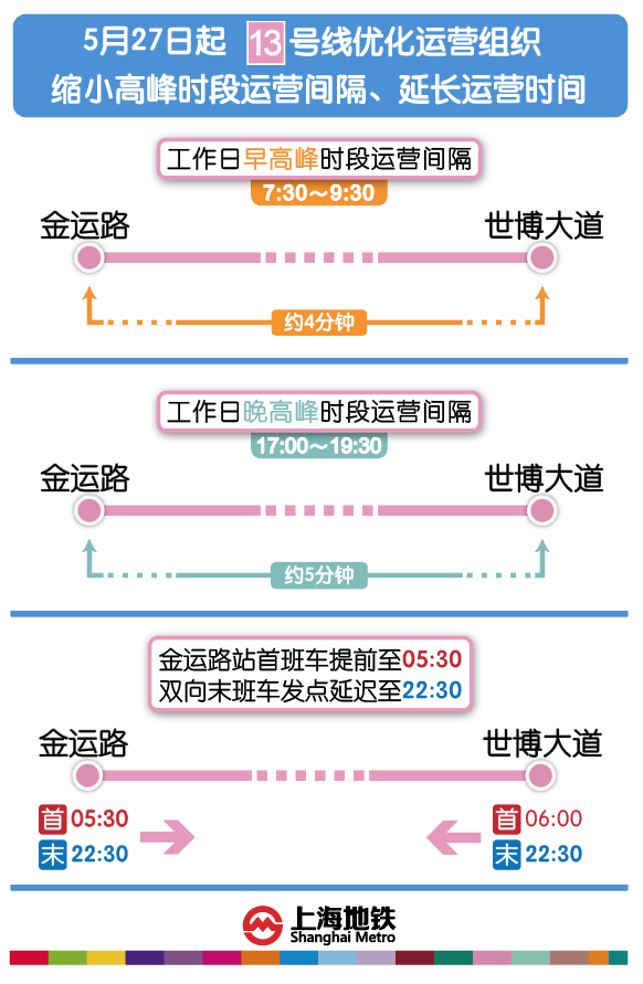 另外,針對網友反映的13號線末班車時間結束較早的問題,地鐵運營方也是高度重視。5月27起,13號線延長了全天運營時間,根據計劃:啟用新列車運行圖后,13號線金運路站的首末班車時間由原先的5:50和22:11,調整為5:30和22:30,調整后金運路往世博大道方向全天運營時間增加39分鐘;而13號線世博大道站的首班車時間維持在6:00不變,末班車時間由原先的22:08調整為22:30,調整后世博大道往金運路方向全天運營時間增加了22分鐘。