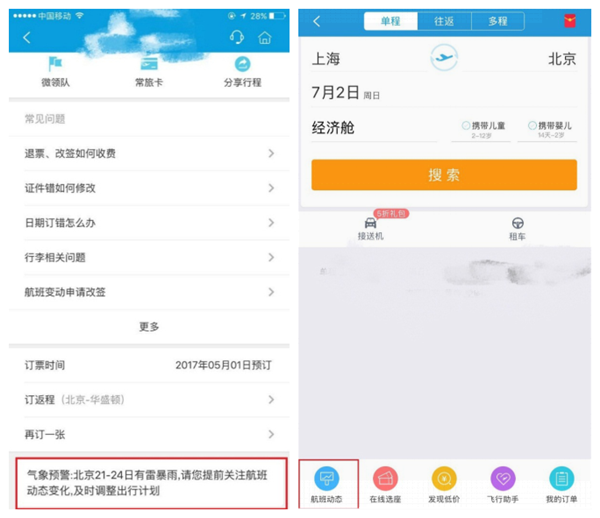 攜程機票部門也將針對航班做好提醒。提醒主要包括短信提醒、站內信提醒、訂單詳情頁的提醒和App端的出行提醒等。同時,消費者來電詢問時,也將第一時間告訴消費者目前的航班信息等情況。針對消費者提出的改簽、退票等需求,攜程也將按航司規定,盡快協助完成相關操作。同時,在訂單詳情頁,消費者也可自助提交退票或改簽需求。
