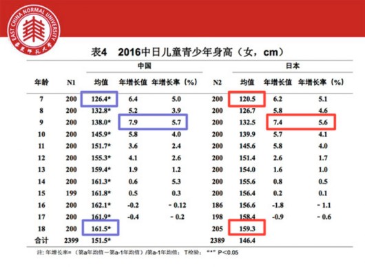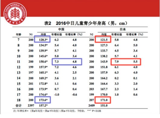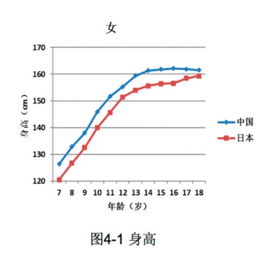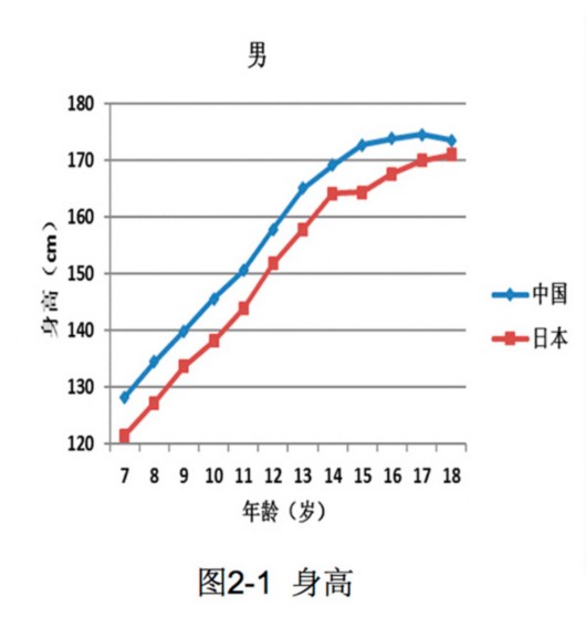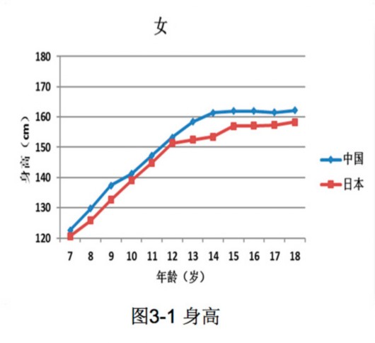 譬如,7-18歲中日兒童青少年(男)身高統(tǒng)計(jì)中,除12歲外,中國(guó)男生均顯著高于日本男生。中國(guó)女生各年齡段也均顯著高于日本女生。