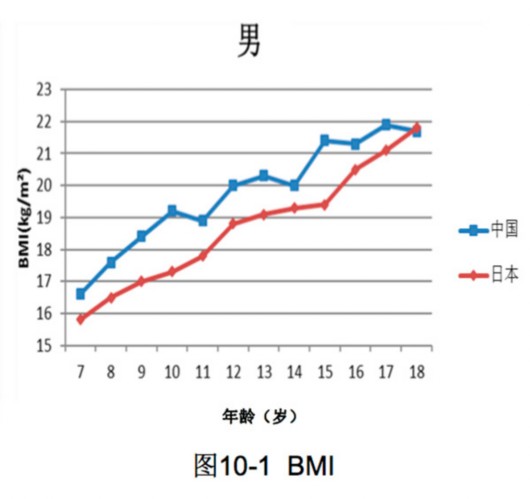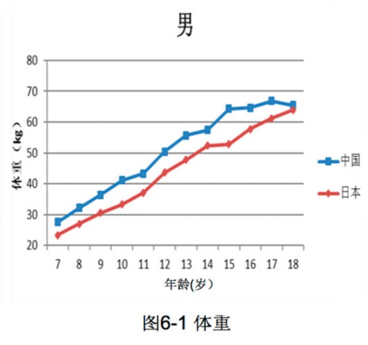 其中,2014年,7-18歲中國(guó)男生平均體重48.7kg,高于日本男生的44kg,而在2016年,7-18歲中國(guó)男生平均體重50.4kg,高于日本男生的44.3kg。