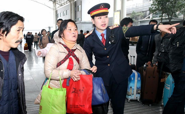 滬港列車長李喆(右一)在上海火車站引導服務旅客出站。