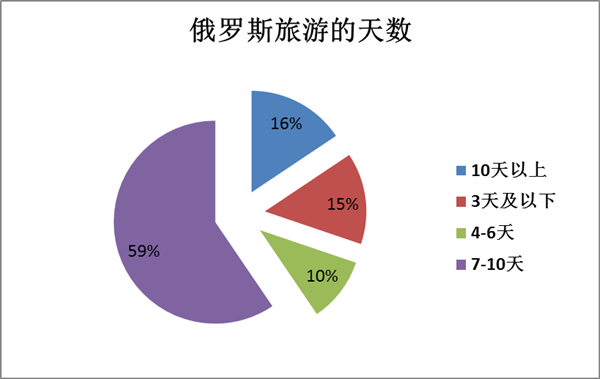 59%的中國(guó)游客赴俄羅斯在7到10天,有16%的人一次旅游10天以上。