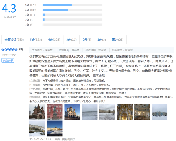 從參團(tuán)游客的點(diǎn)評(píng)看,中國(guó)游客對(duì)俄羅斯旅游的評(píng)價(jià)很高,對(duì)紅色旅游景點(diǎn)最感興趣。從網(wǎng)上數(shù)百條熱門產(chǎn)品的點(diǎn)評(píng)看,平均分達(dá)到4.6分以上(滿分5分)。