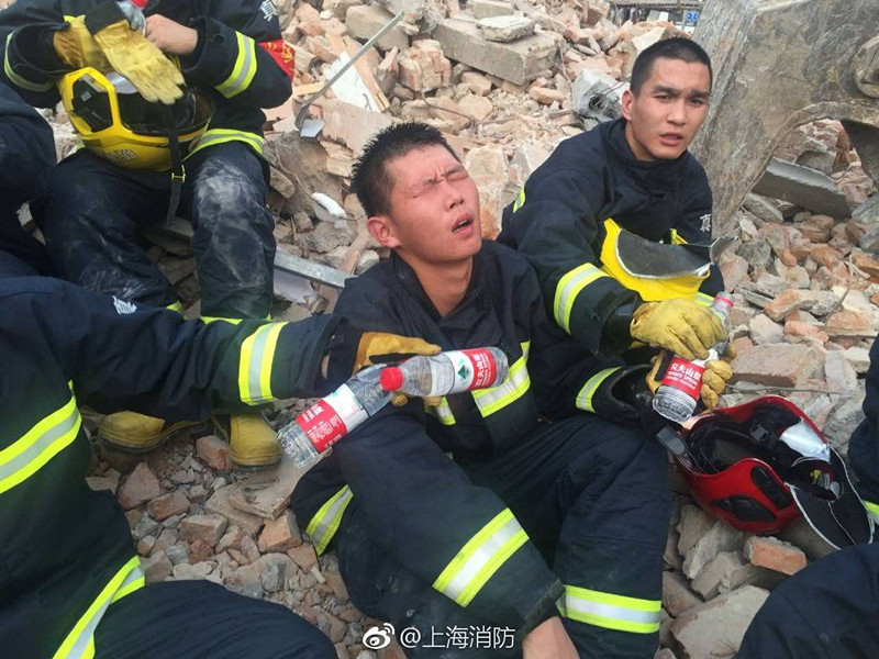 今天是上海創紀錄的高溫天,下午在救援現場,消防員持續救援,分批休息。下午3點多,不少人累癱了坐在馬路邊喝水,用水澆自己,還有的用冰塊敷額頭降溫。消防員全副武裝工作中,有個別人出現輕微中暑現象。截至發稿,救援工作還在繼續。