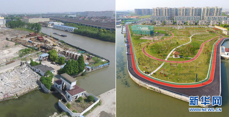吳淞江北岸整治中(左圖)和整治后(右圖)。 (新華網 發)