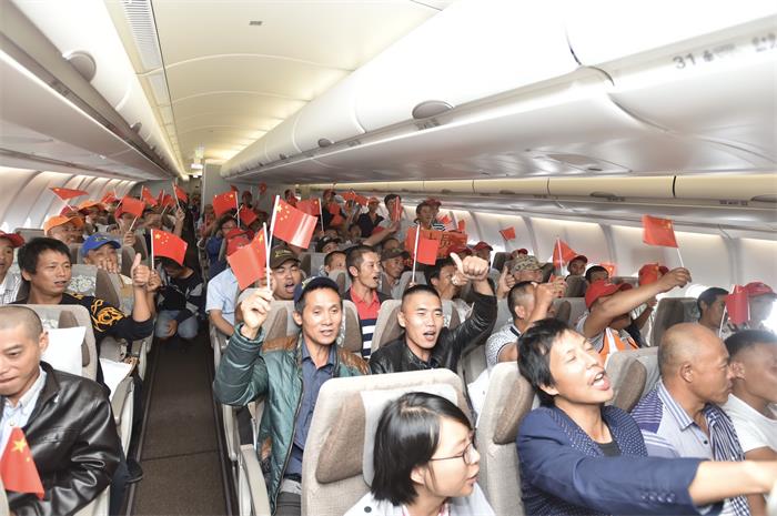 “祖國萬歲!熱烈歡迎同胞回家!”10月1日夜間的上海虹橋機場燈火通明。在這舉國歡迎的日子里,伴隨著飛機的轟鳴聲,21:04分和21:39分,兩架東航A330客機分別降落,381名在加勒比颶風中受災的同胞安全順利地回到祖國的懷抱。中國商務部、民航華東管理局、東航、上海市商委以及相關企業的領導在機坪上迎接歸國同胞和東航全體機組成員凱旋。至此,東航歷時4天圓滿完成了多米尼克中方人員緊急轉移回國任務。