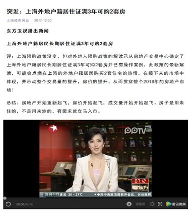 2017年12月30日,上海網警在公開巡查執法中發現,微信公眾號“上海樓市風云”發布了題為《突發:上海外地戶籍居住證滿3年可購2套房》的文章,文中杜撰“東方衛視播出新聞,上海外地戶籍居民長期居住證滿3年可購2套房”、“此政策的最新解讀,可能會點燃在上海的外地戶籍居民購買2套住宅的熱情,在接下來的市場中體現,并帶動整個交易量的提升,房價的提升,從而貫穿整個2018年的房地產市場”等內容,并添加了新聞視頻片段,以提高其可信度。