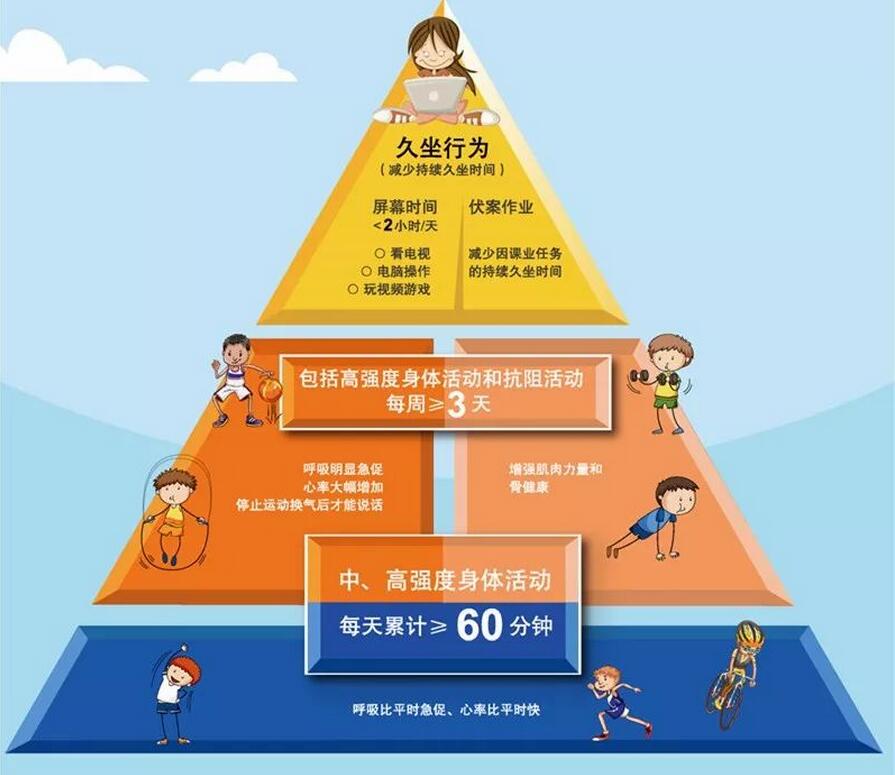 除身體活動(dòng)的每日推薦量之外,本次指南還專門強(qiáng)調(diào)了久坐行為對(duì)健康的危害。為此,指南特別建議在保證每天60分鐘中高強(qiáng)度運(yùn)動(dòng)時(shí)間以外,兒童青少年每日屏幕時(shí)間應(yīng)限制在2小時(shí)內(nèi),并減少持續(xù)久坐行為,在課間休息時(shí)應(yīng)進(jìn)行適當(dāng)?shù)幕顒?dòng)。