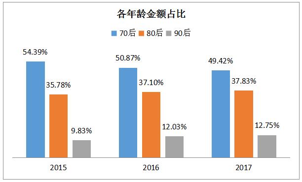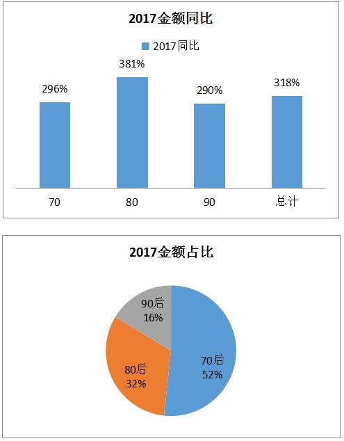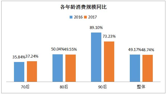 從消費人群變化看,70后消費貢獻當仁不讓,80、90后正加快成長。2015年至2017年三年期間,70后始終作為消費核心力量,貢獻了70、80、90后消費整體規模的近一半。