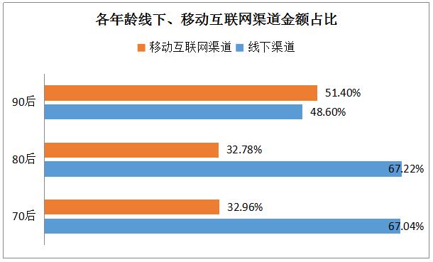 從2017年各年齡在移動互聯網渠道及線下實體渠道的消費金額占比來看,90后移動互聯網渠道消費金額占比51.40%,已超過消費金額的一半;而70、80后線下實體渠道消費仍為核心,消費金額分別占比67.04%、67.22%。