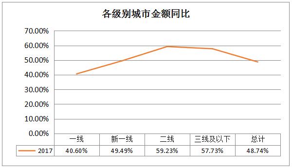從消費地區變化看,二三四線城市消費快速崛起,增速超一線近1.5倍;粵、京、滬消費貢獻全國前三;華中、東北、西北地區增速名列前茅。2017年,二線與三四線城市增速達59%、58%,增幅顯著高于一線及新一線城市,且增速優勢不斷擴大。