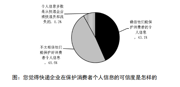 半數(shù)以上的消費者擔憂快遞公司無法有效保護消費者的個人信息調查數(shù)據顯示,約有48.6%的消費者表示“不太相信他們能保護好消費者個人信息”,8.3%的消費者認為“個人信息多數(shù)是從快遞企業(yè)或快遞員那流失的”。