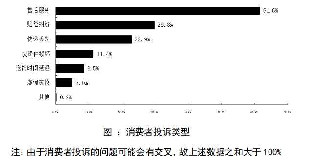此外,大數(shù)據顯示售后服務是消費者投訴較集中的問題。通過大數(shù)據分析,消費者對快遞售后服務投訴主要集中在快遞丟失、快遞件損壞、虛假簽收、送貨時間延遲和賠償糾紛這幾個方面。通過數(shù)據分析發(fā)現(xiàn),當前投訴較為集中的是售后服務(61.6%),其后依次是賠償糾紛(29.8%)、快遞丟失(22.9%)、快遞件損壞(11.4%)、送貨時間延遲(8.5%)、虛假簽收(5.0%)和其他(0.2%)。