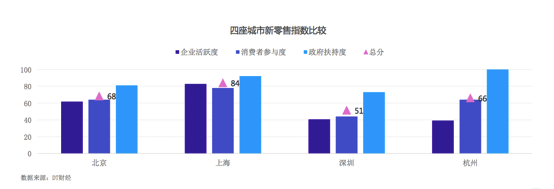 報(bào)告從企業(yè)活躍度、消費(fèi)者參與度、政府扶持度等多個(gè)維度進(jìn)行綜合分析,最終得出一系列新零售指數(shù),用于評估一座城市的新零售活力。
