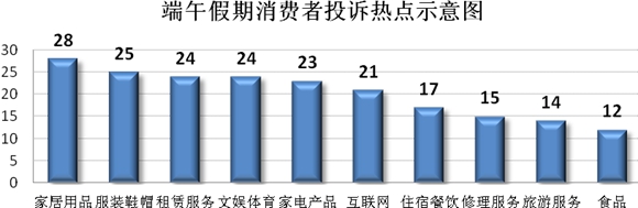 2018年端午假期,東方網記者從上海市工商局12315中心獲悉,端午假期共受理消費者投訴舉報412件(投訴385件、舉報27件),解答各類咨詢201件,其中線上消費投訴占投訴總量61%,家居用品(28件)、服裝鞋帽(25件)、租賃服務(24件)、文化娛樂和體育服務(24件)、家電產品(23件)等投訴量居前。