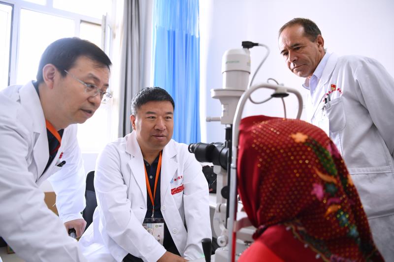 100多名當(dāng)?shù)匕傩罩孬@光明,兩天內(nèi),已為714名患者義診,其中116名患者手術(shù)后重見光明,3天后獲義診病人達(dá)879例,141名患者重見光明。78歲的艾沙汗大娘坐了8小時(shí)車來到塔縣,胸前別著黨徽的68歲的鐵里木汗和49歲的鐵米爾……手術(shù)室外的門診擠滿做完白內(nèi)障手術(shù)來復(fù)查的人。醫(yī)院醫(yī)生護(hù)士們拉著醫(yī)療隊(duì)的醫(yī)生和志愿者們?nèi)ゼ依镒隹停藗冎灰匆姶┌状蠊拥闹驹刚邆儽銜?huì)停下來,專程相送。