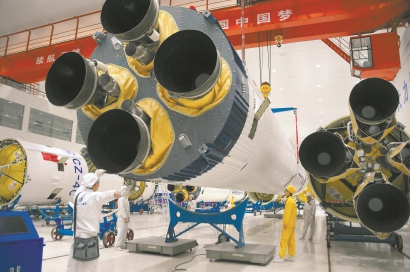 為火箭稱完“體重”,十幾名總裝人員各就各位,用繡花般的功夫打磨著火箭上的每一個部位。