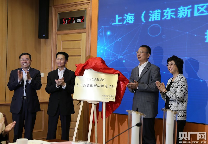 工業和信息化部總經濟師王新哲、上海市副市長吳清、工信部科技司司長胡燕、浦東新區常務副區長姬兆亮、出席并共同為“上海(浦東新區)人工智能創新應用先導區”揭牌。(央廣網發 上海市經信委 供圖)