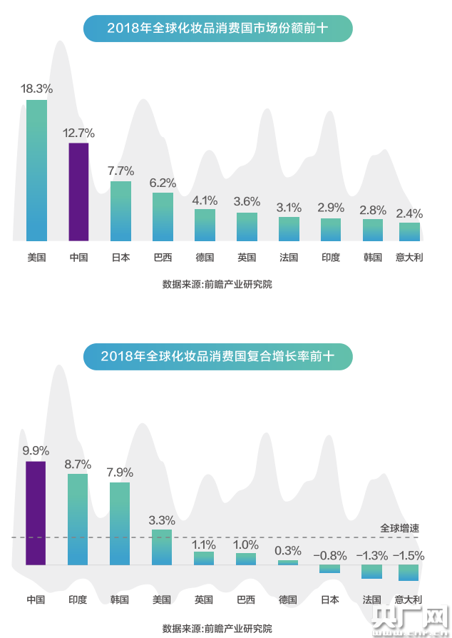 2018年全球化妝品消費國市場份額及復合增長率Top10(央廣網發 奉賢區新聞辦供圖)