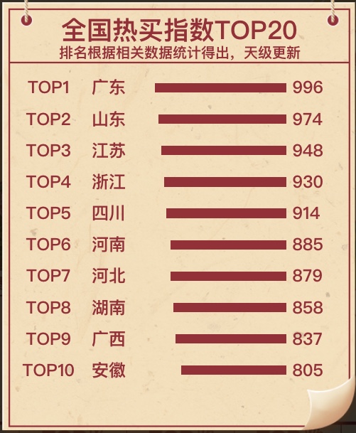 ▲榜單顯示,在支持國(guó)貨這件事上,廣東、山東、江蘇、浙江、四川等地的消費(fèi)者“毫不手軟”。