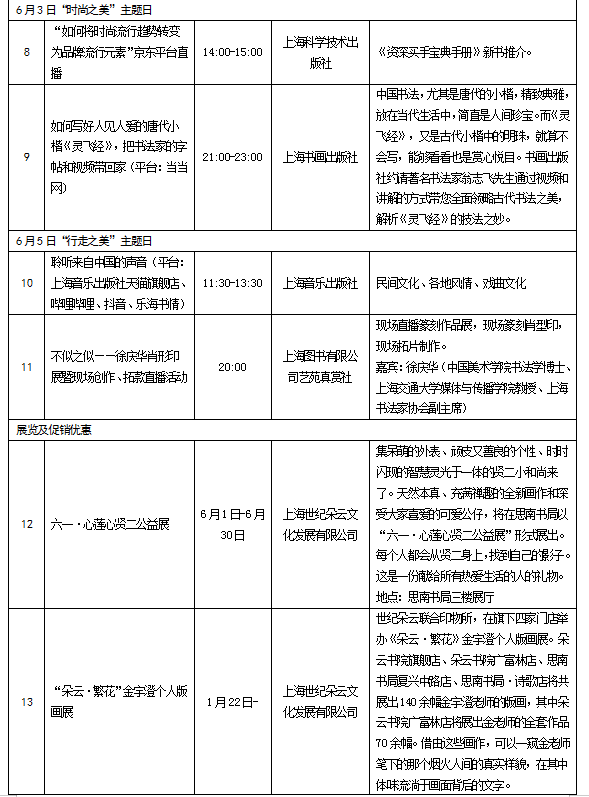 各類經典展覽、促銷活動也紛至沓來,文化藝術愛好者可以在線上欣賞上海古籍出版社“夢影紅樓 藝文雅聚” 紅樓精品圖書聯展,上海書畫出版社“帶您領略古代書法之美,解析唐代小楷《靈飛經》的技法之妙”活動,上海圖書公司“不似之似——徐慶華肖形印展直播活動”,也可以參加線下書店“朵云·繁花”金宇澄個人版畫展,上海外文書店“詩與遠方——旅游文化書籍特別展”“時尚之美——設計藝術書籍精選展”等活動,并享受集團旗下實體書店各類圖書、文創產品優惠促銷活動。直播平臺、優惠促銷活動請關注下方表格,播放平臺及時間以各單位發布為準。