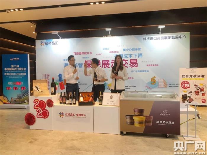 在一街之隔的虹橋品匯線下直播間,主持人已經(jīng)品嘗到保稅倉同款Godiva冰激凌,現(xiàn)場銷售價格是99元6盒。意大利姑娘向主持人介紹各種葡萄酒。進博會展商華飲公司的圣蝶白葡萄酒去年進博會后銷售在虹橋品匯銷售1.5萬瓶。此次疫情后第一批清關貨物第二天就在虹橋品匯上架銷售,55購物節(jié)期間售價是89元一瓶,電商平臺的售價是398元。據(jù)悉,虹橋品匯為進博展商提供“兩免兩統(tǒng)一”的便利(免除場地租金、免入場保證金、提供統(tǒng)一裝修和道具、提供統(tǒng)一導購和收銀),及保稅倉半年的免租政策,使得進博展商便利入駐,消費者得實惠。