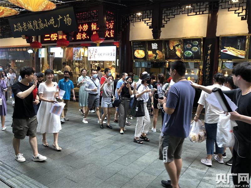 在豫園松鶴樓里,主播在為消費(fèi)者介紹美食(央廣網(wǎng)記者 韓曉余 攝)
