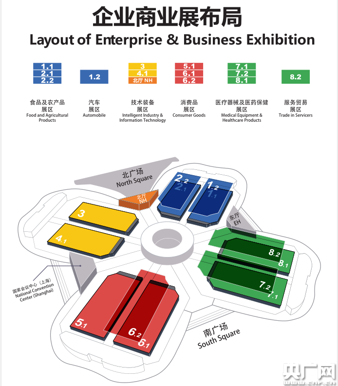 第三屆進博會企業商業展規劃面積36萬平方米,共設服務貿易、汽車、技術裝備、消費品、醫療器械及醫藥保健、食品及農產品六大展區。根據今天公布的展區圖,食品及農產品展區分布在1.1、2.1和2.2號館,汽車展區在1.2號館,技術裝備展區在3號館、4.1號館以及北廳,消費品展區在5.1、6.1和6.2號館,醫療器械及醫藥保健展區在7.1、7.2及8.1號館,服務貿易展區則在8.2號館。