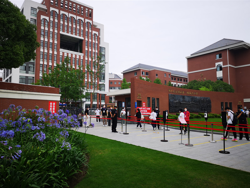 記者在位于上海市徐匯區的南洋中學考點看到,學校大門所在的龍華中路也是進行了交通管制,馬路邊作為家長的臨時停車場。根據上海市教育考試院的建議,希望考生能提前45分鐘就到達現場。剛才八點鐘左右,考生已經開始陸續進場,F場的考生、老師和家長們也基本上都戴著口罩,校門口還準備了免洗洗手液,并要求考生保持一米以上間距排隊測溫入場。