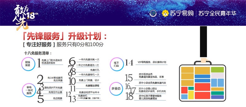 具體來看包括:針對蘇寧線上線下購買產品,可享免費上門取件退換貨,極速退款服務。針對門店購物方面,將有VIP金牌導購服務、店長接待計劃。針對家電細分領域,將推出免3米管線費用、免高空作業費、一年之內免費清洗一次、免費打孔;免費上門測量、設計、調試;免費換機(一年內有任何質量問題,只換不修)等服務。在多業態方面,蘇寧百貨會員免費清洗黃金飾品、手表;蘇寧小店會員可享免費快遞代收,小店暖心驛站將為前線的快遞小哥、安裝維修工等群體,提供免費微波爐使用、手機充電等;蘇寧紅孩子免費育嬰師服務,嬰兒到店免費理發。