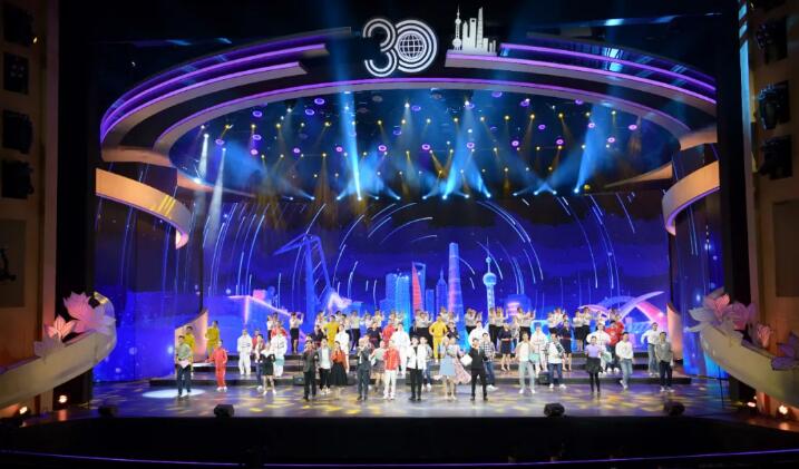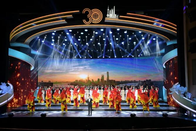 晚會以1990年央視《新聞聯播》播報中共中央、國務院宣布浦東開發開放的畫面開篇,通過“音詩畫”立體藝術呈現方式,采用多媒體交響配樂朗誦串聯各篇章節目,深度挖掘紅色文化、海派文化、江南文化資源,凸顯詩韻秀美、跨界融合、科技創新,充分彰顯上!昂<{百川、追求卓越、開明睿智、大氣謙和”的城市精神和“開放、創新、包容”的城市品格。