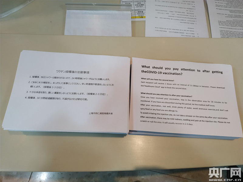 現(xiàn)場為外籍人士準(zhǔn)備了接種后注意事項(xiàng)說明,有英語和日語兩個版本。(央廣網(wǎng)記者林馥榆 攝)