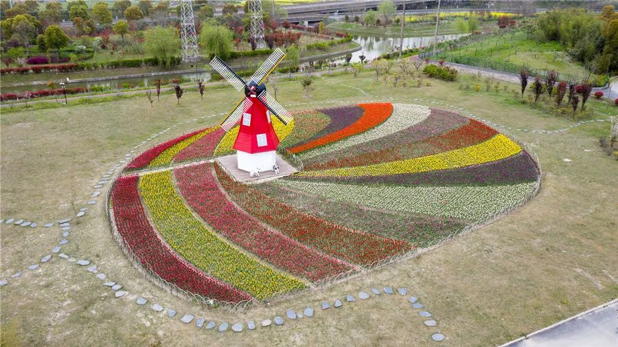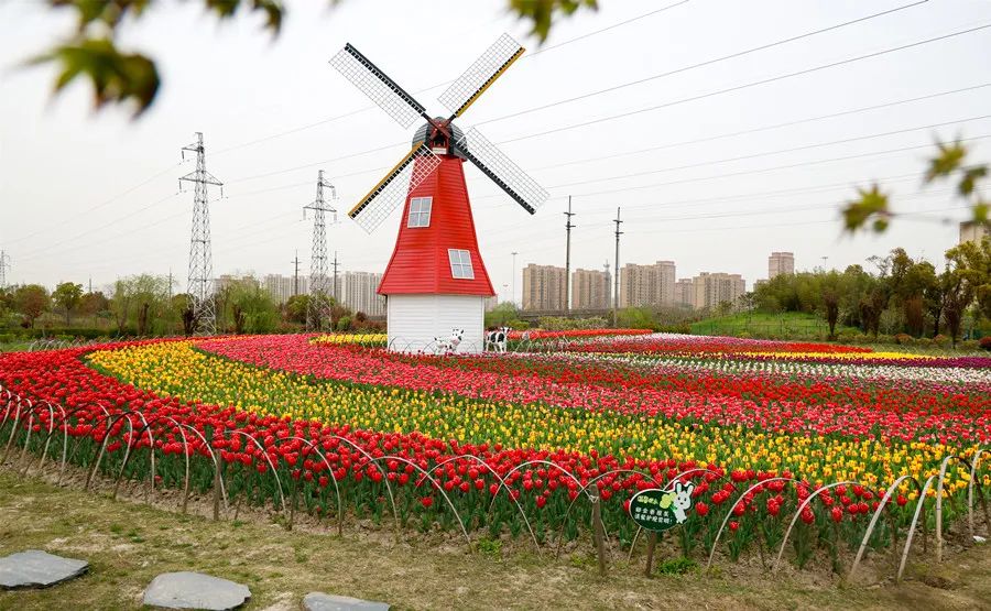 在菊園百果園,五彩斑斕的郁金香朵朵飽滿,宛如酒杯,在微風(fēng)中與大風(fēng)車造景相映成趣,形成了獨具特色的“小荷蘭”景觀。