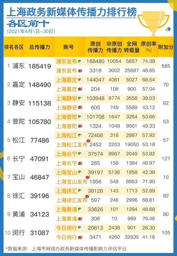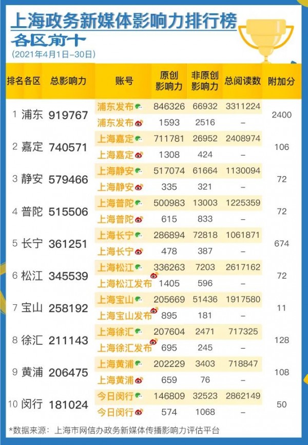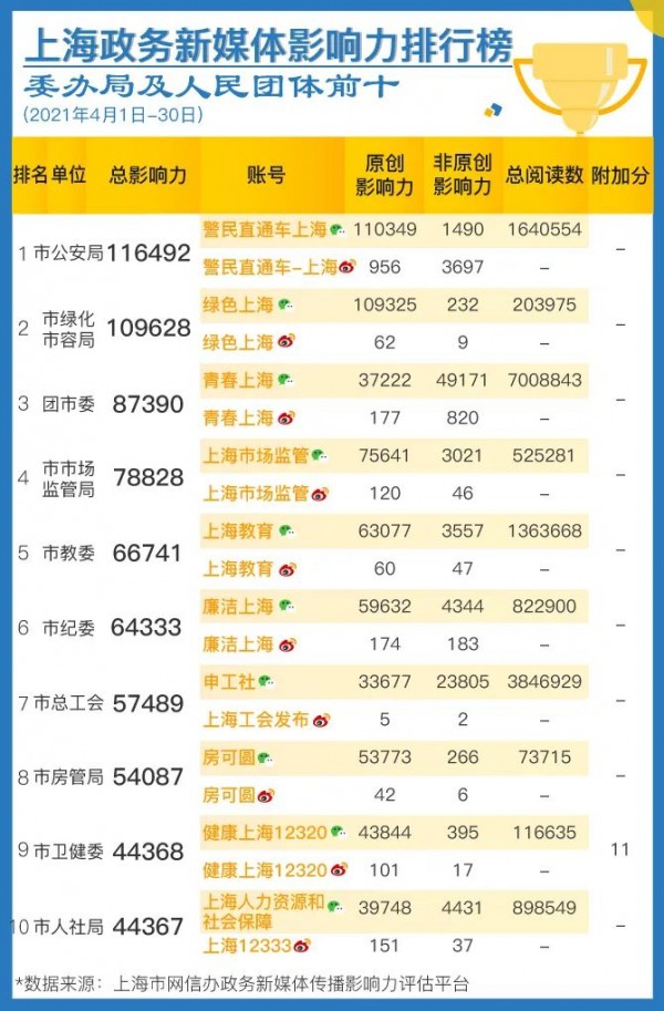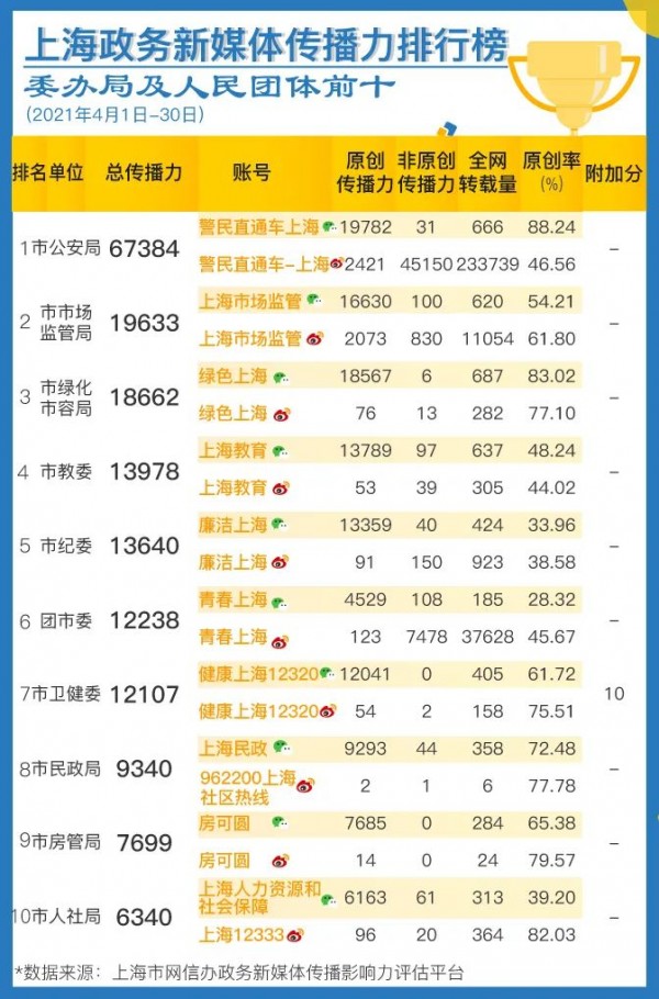 榜單由上海市委網信辦與上海市政府新聞辦公室聯合發布。數據來源于上海市委網信辦自主研發的“政務新媒體傳播影響力評估平臺”,目前該平臺覆蓋全網各渠道,納入了276個新聞客戶端、251家新聞網站、1200萬微信公眾號、3億多微博賬號的數據。